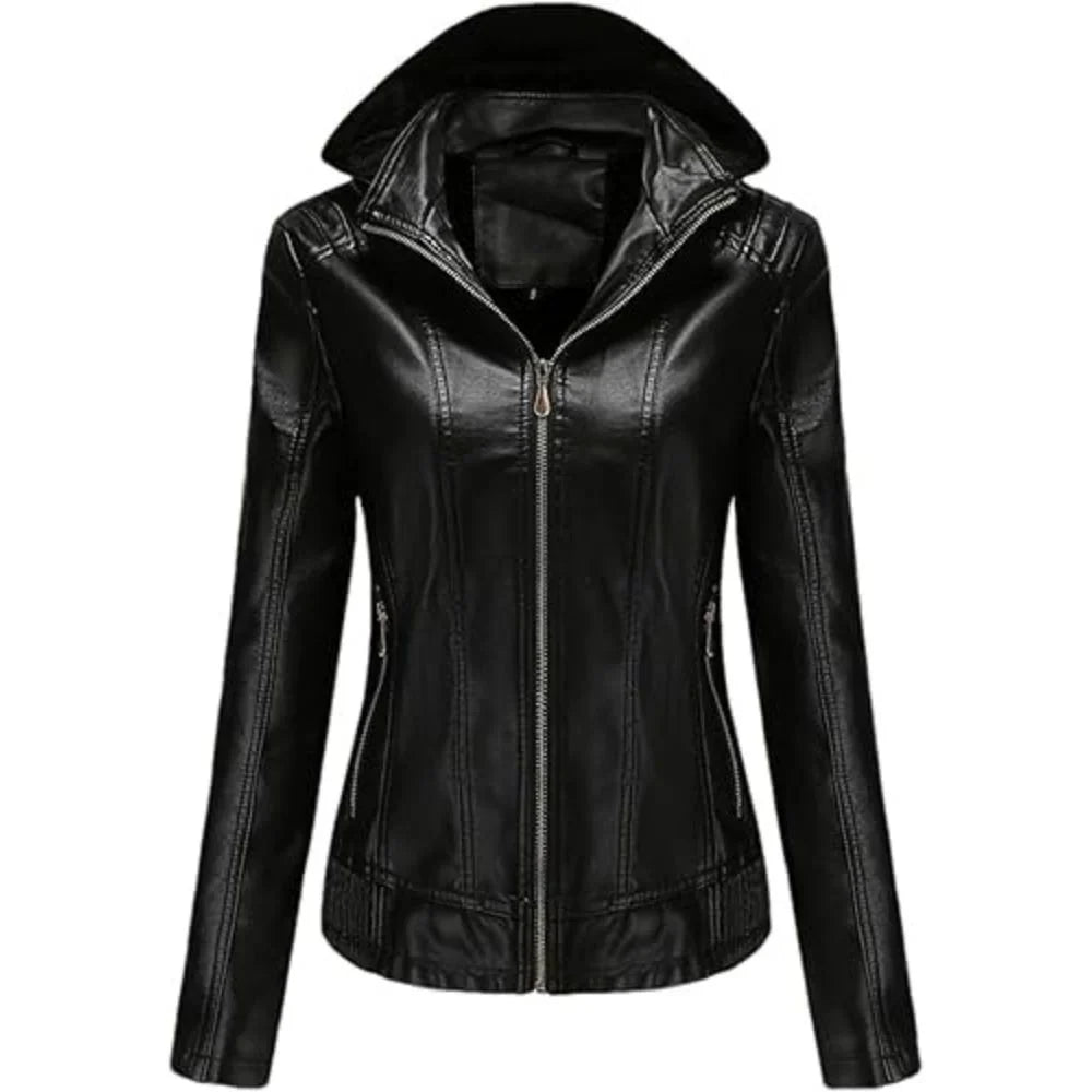 Women's Classic Black Fall Winter Biker Warm Hoodie Leather Jacket