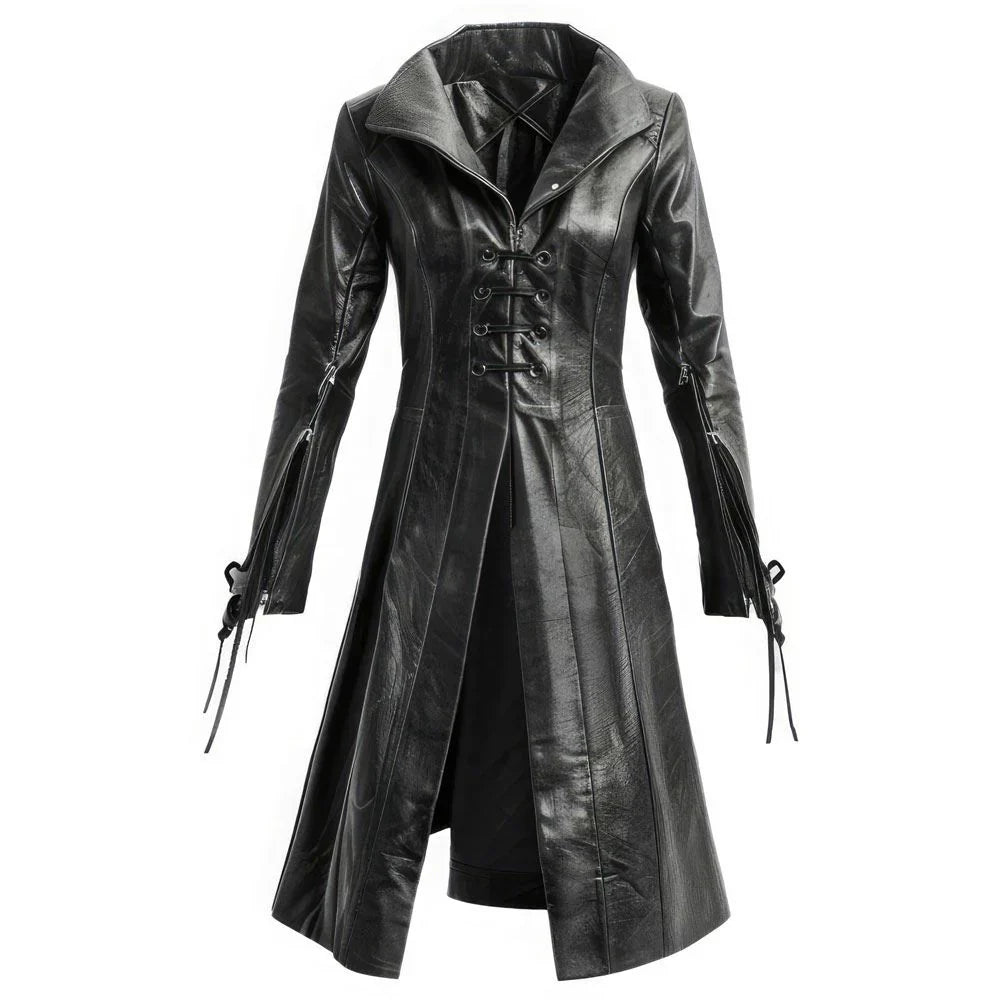This is one of the gothic elegance stand-out pieces. The women's long black winter trench coat is made from high-quality leather that is both stylish and durable. The cuffed sleeves with tie closures and pointed collar give the jacket an edgy appeal. A lace-up clasp at the front of the coat adds a rebellious edge to its look.